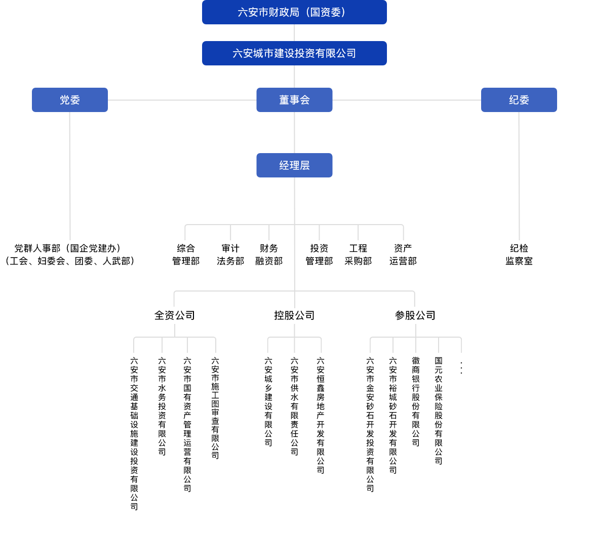 公司全資二級公司4家,分別為:六安市交通基礎設施建設投資有限公司、六安市水務投資有限公司、六安市國有資產管理運營有限公司、六安市施工圖審查有限公司。三級公司12家,分別為:六安路宇淠河大橋開發有限公司、六安市交投產業運營管理有限公司、六安建設發展有限公司、六安市城鄉建設有限公司、六安市六舒產業投資有限公司、六安市砂石開發投資有限公司、六安市潔康環保醫療廢棄物集中處置有限責任公司、六安市小額貸款有限責任公司、六安市新能源智慧停車服務有限公司、六安市石寶山陵園開發有限公司、六安市城建資產經營管理有限公司、六安市樂居商業運營管理有限公司。控股公司3家,參股公司20家。